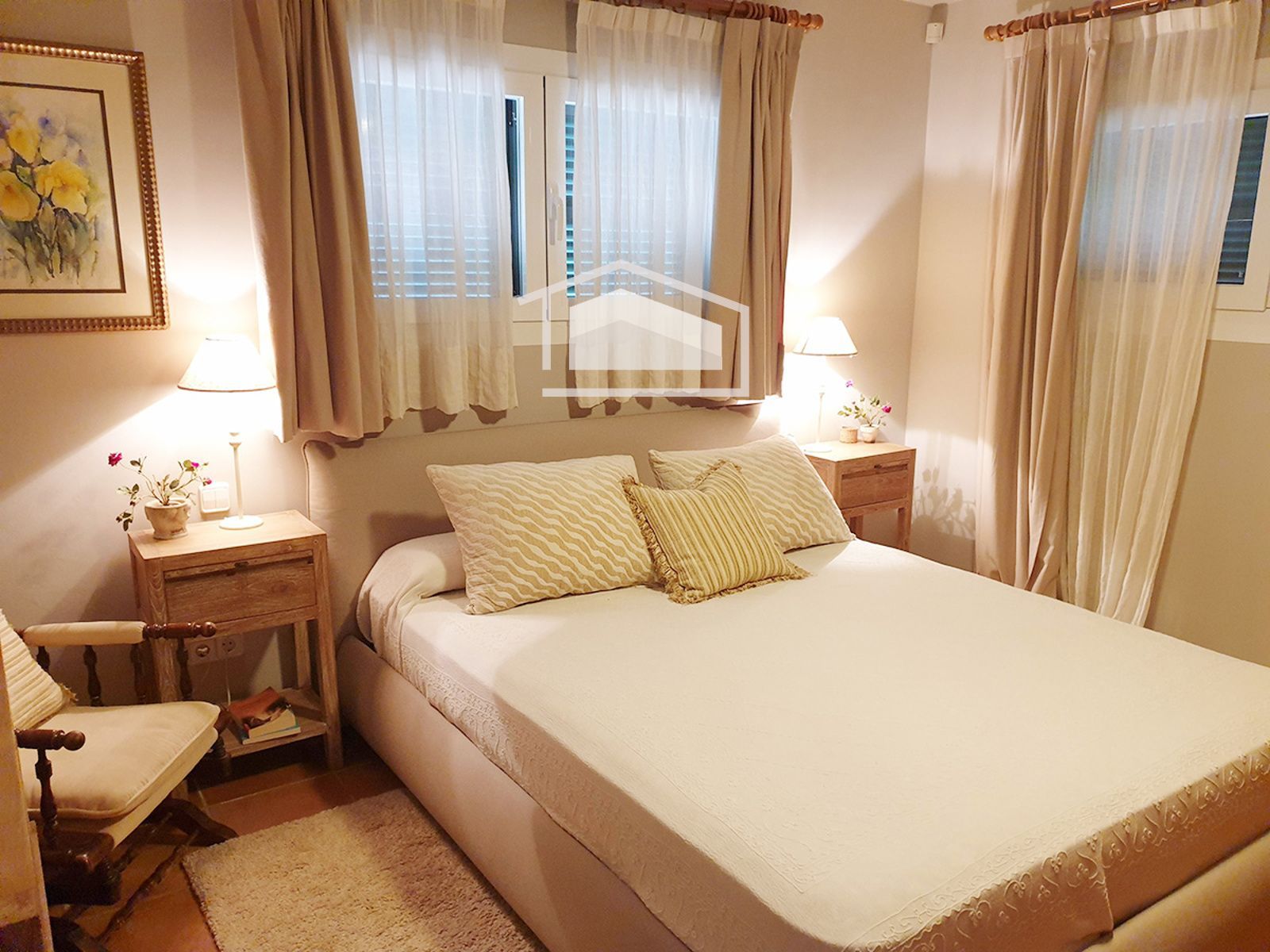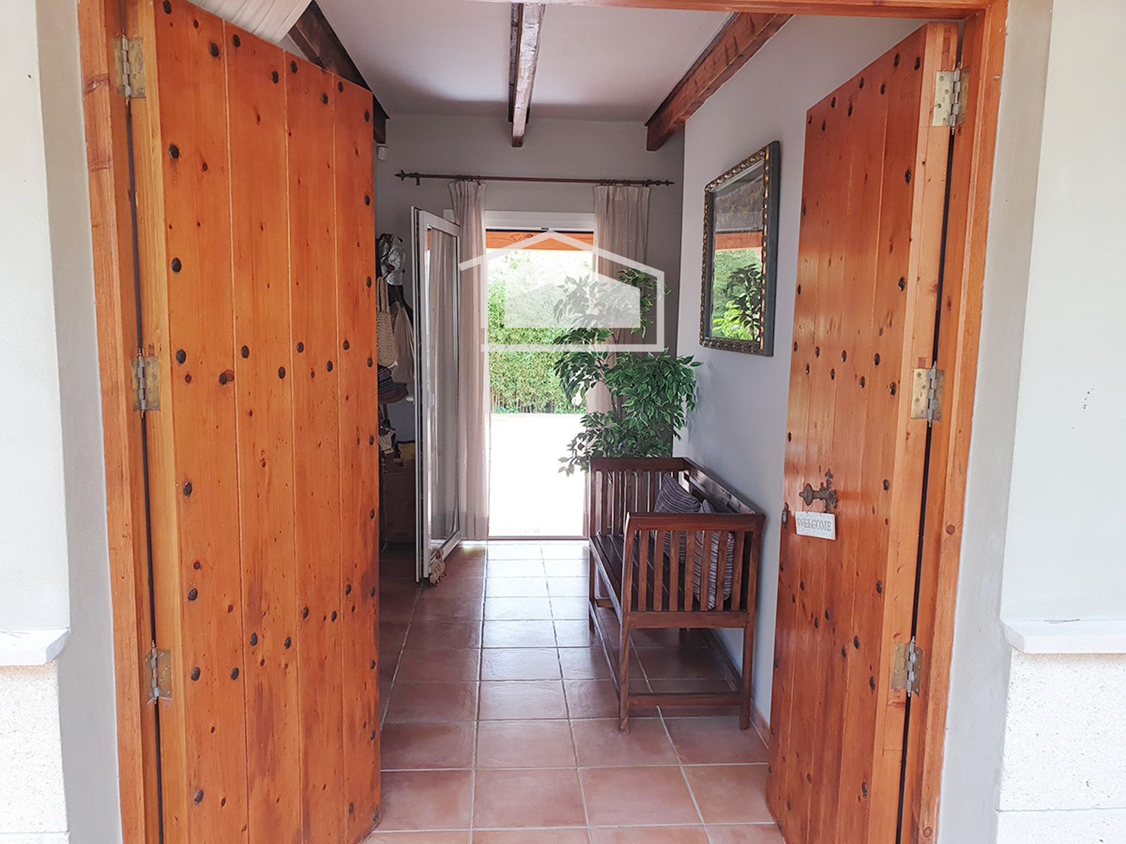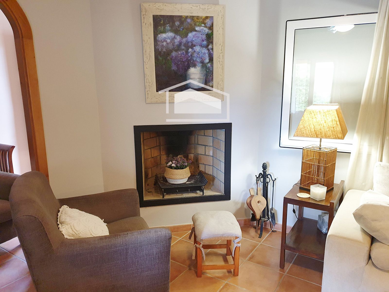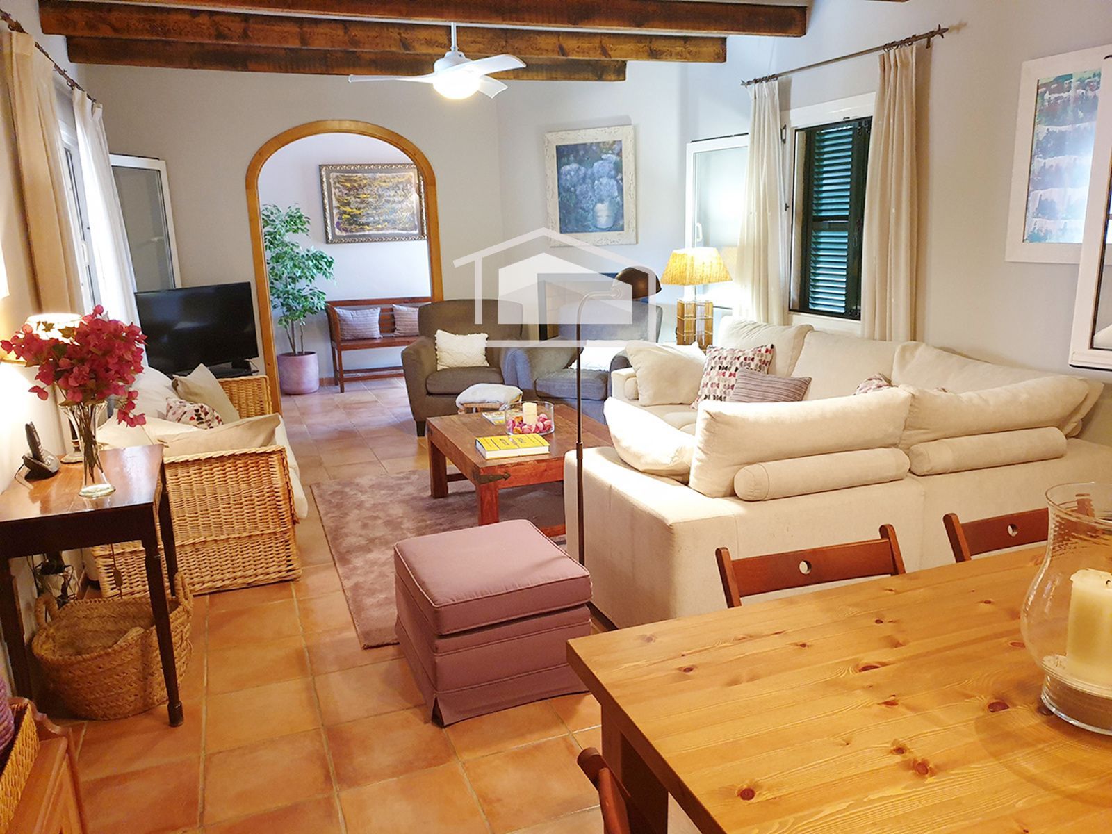 La vivienda se distribuye en una sola planta y destaca por su ambiente cálido y mediterráneo. Dispone de un amplio salón con chimenea y vigas vistas, una cocina office totalmente amueblada y equipada, tres dormitorios dobles con armarios empotrados y dos baños completos, uno de ellos en suite.