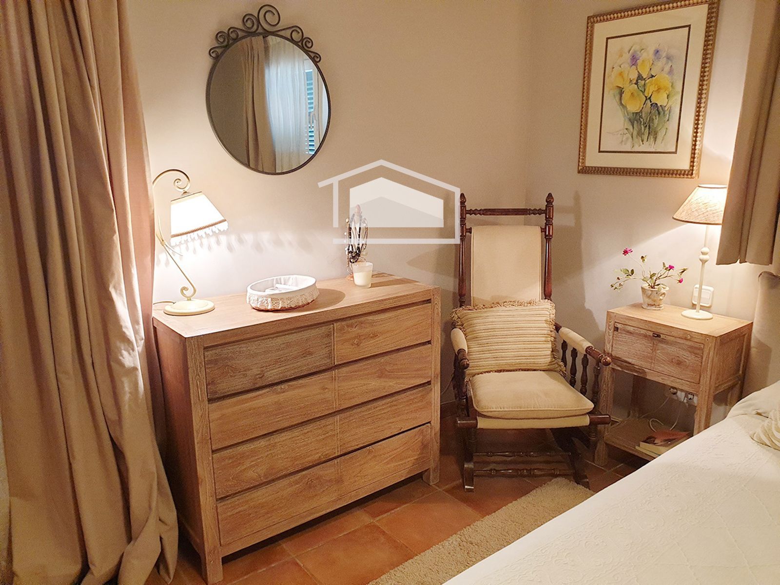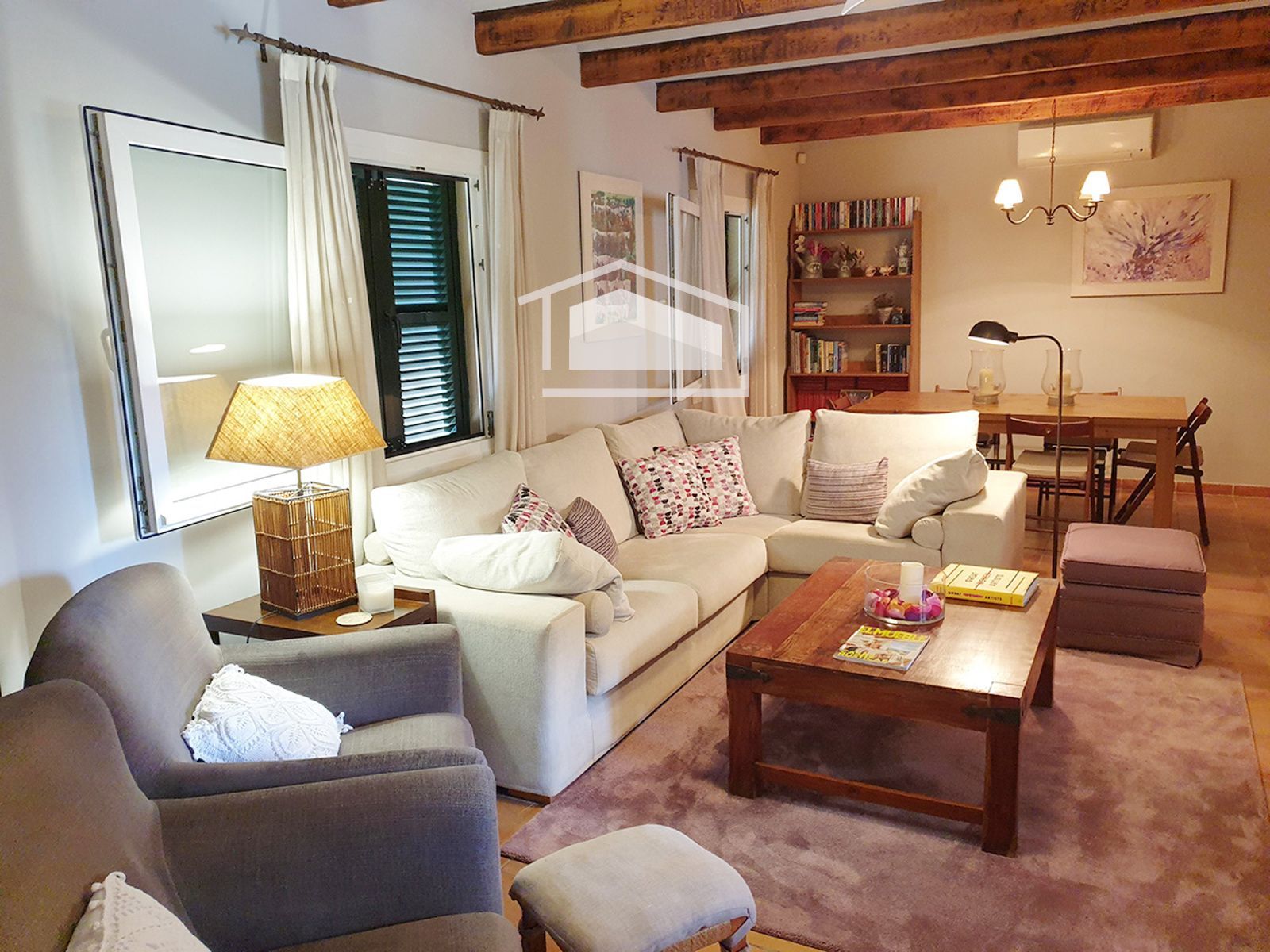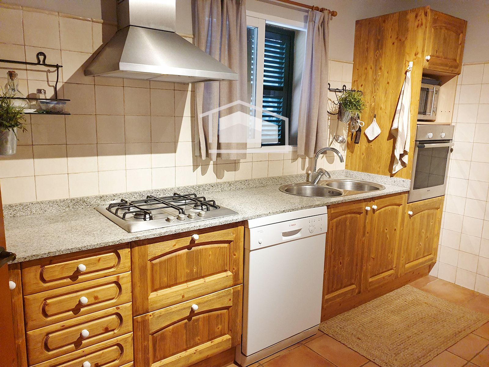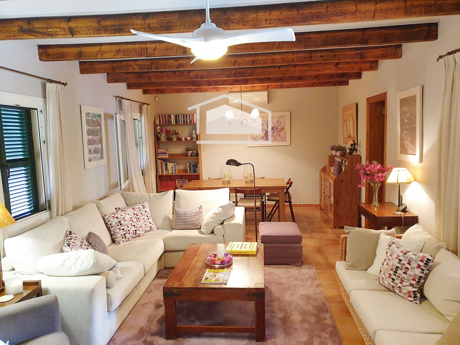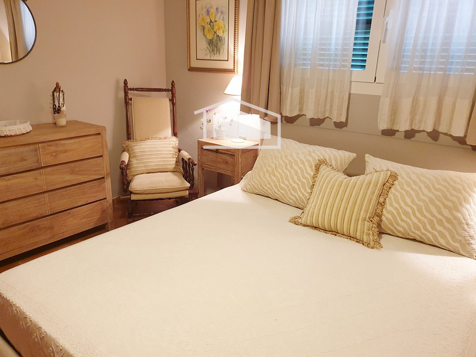 La vivienda se distribuye en una sola planta y destaca por su ambiente cálido y mediterráneo. Dispone de un amplio salón con chimenea y vigas vistas, una cocina office totalmente amueblada y equipada, tres dormitorios dobles con armarios empotrados y dos baños completos, uno de ellos en suite.