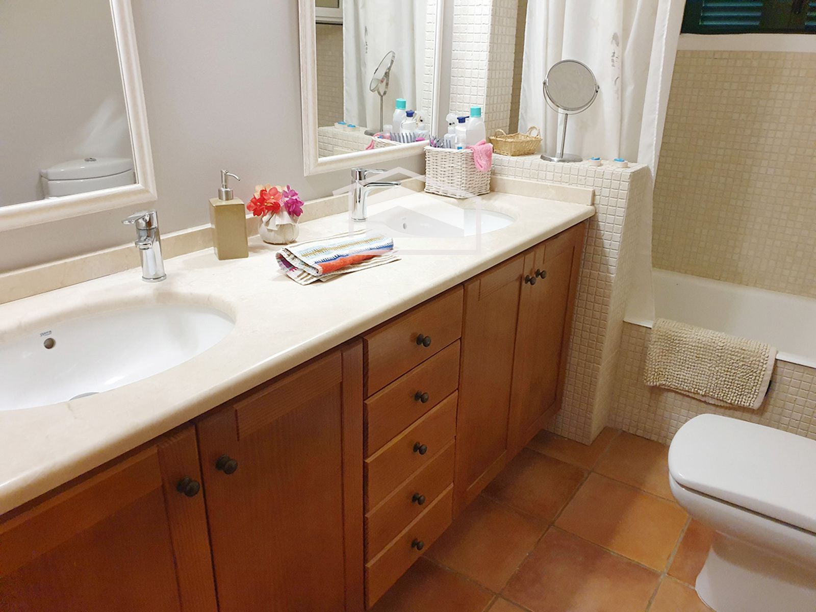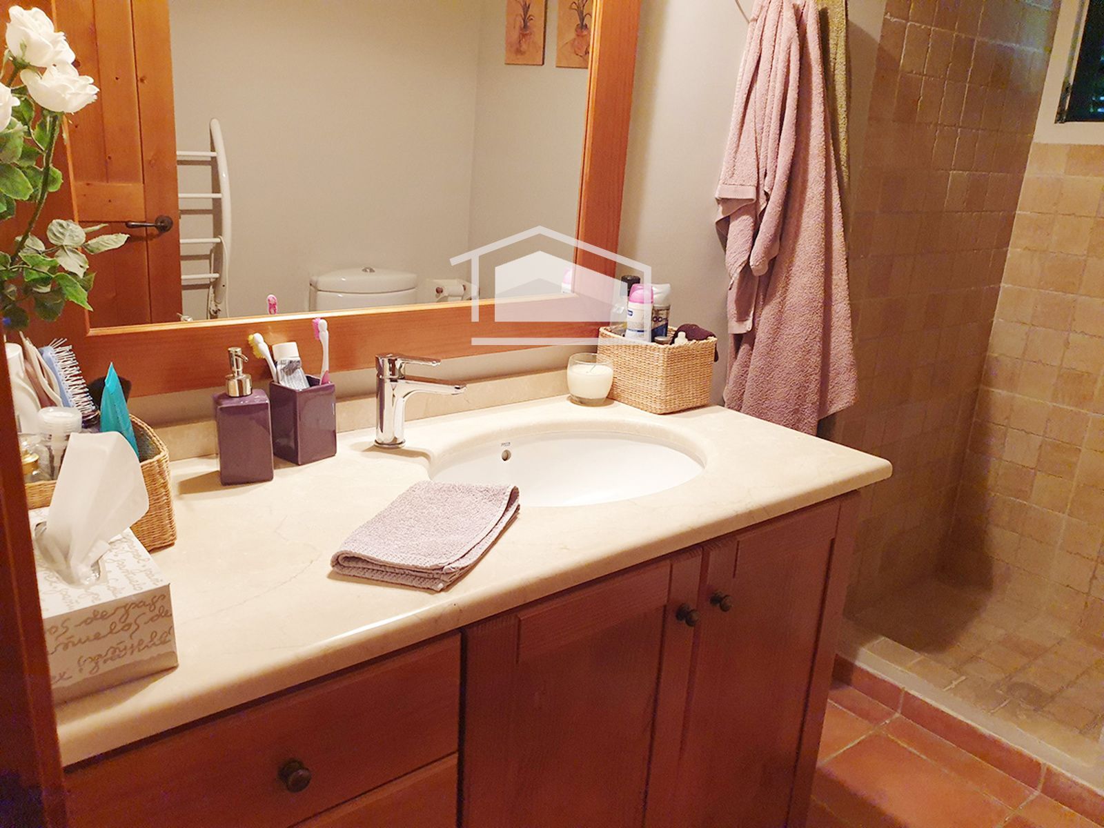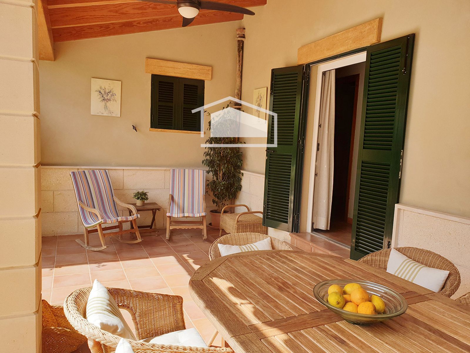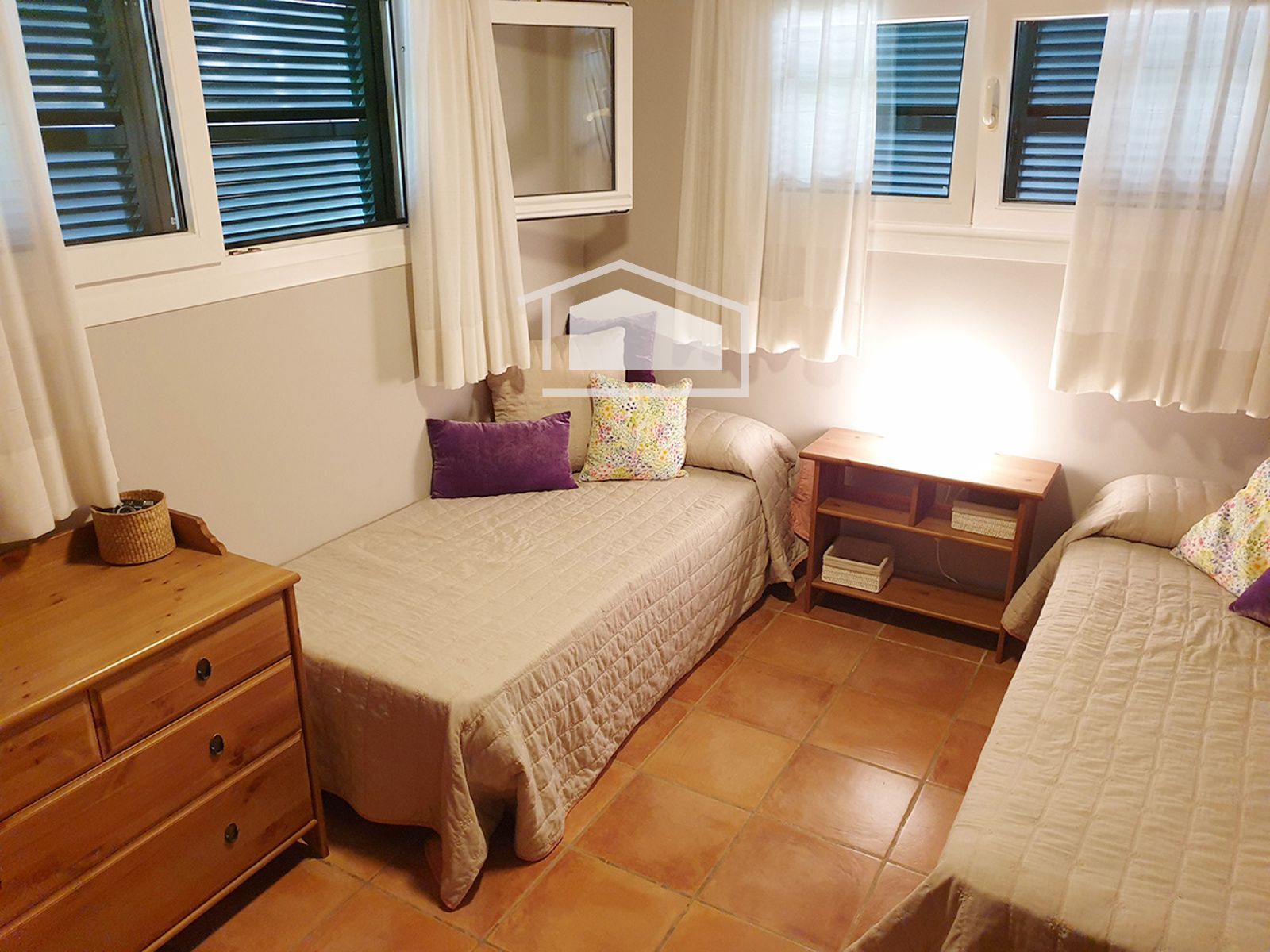 La vivienda se distribuye en una sola planta y destaca por su ambiente cálido y mediterráneo. Dispone de un amplio salón con chimenea y vigas vistas, una cocina office totalmente amueblada y equipada, tres dormitorios dobles con armarios empotrados y dos baños completos, uno de ellos en suite.